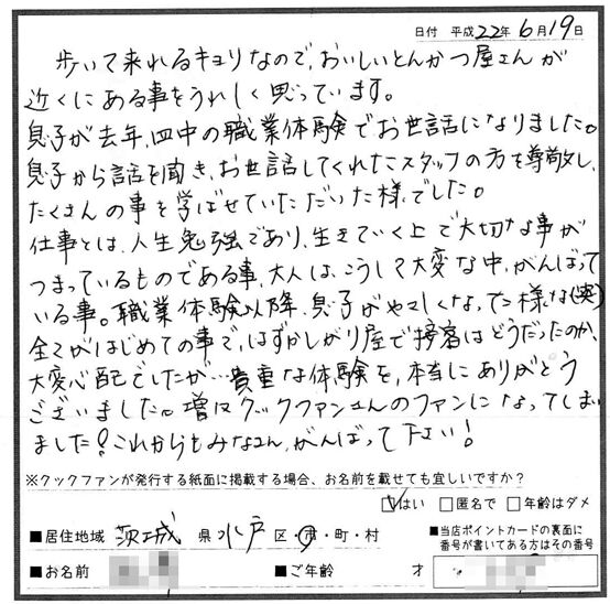 クックファンのテーブルにはお客様が自由に記入できるアンケートのようなものを置いてるんですけど、このような書き込みがありました(゚ー゚)
