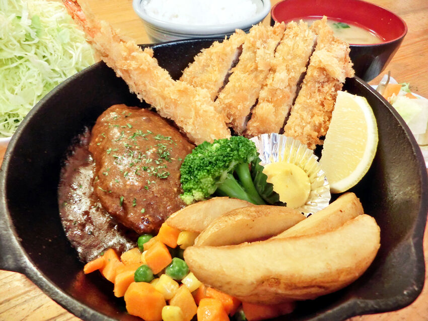 クックファンはとんかつ屋さんですが、ハンバーグもやってます♪昨年から提供させて頂いている「黄金MIX」は、「ハーフサイズのとんかつとハーフサイズのハンバーグ」を一緒に食べられる人気メニューでございます_(_^_)_