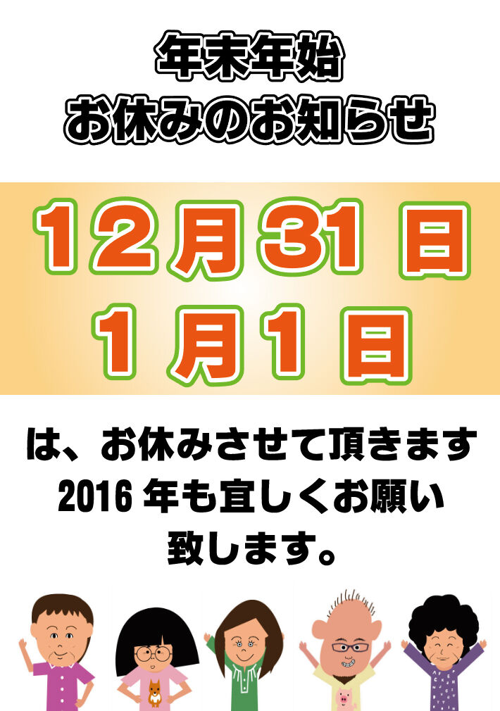 誠に勝手ながら12月31日元旦お休みさせて頂きます。皆様良いお年をお迎えください。