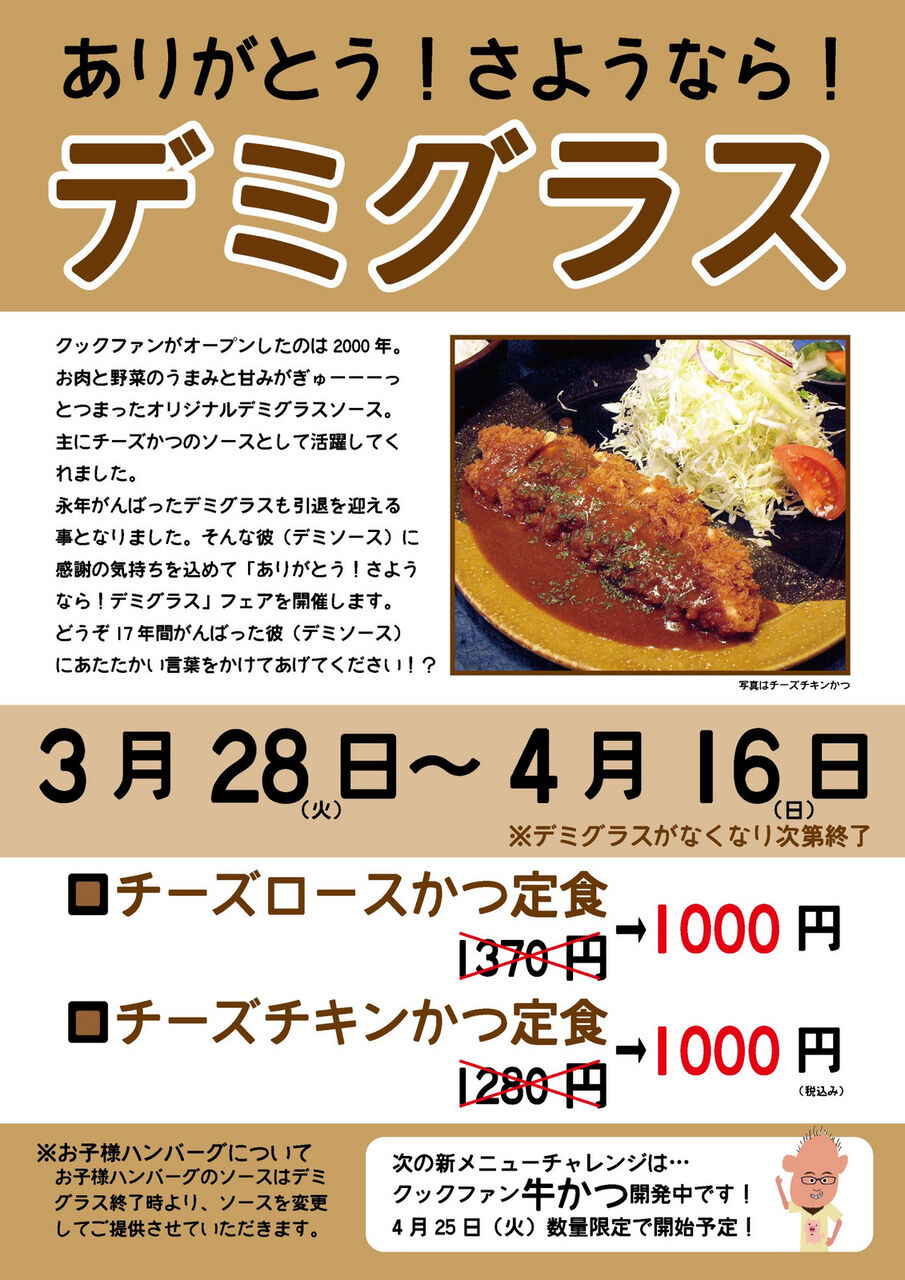 この度、クックファン創業当初からの功労者でもある、デミグラスソースが惜しまれつつも引退することとなりました。
