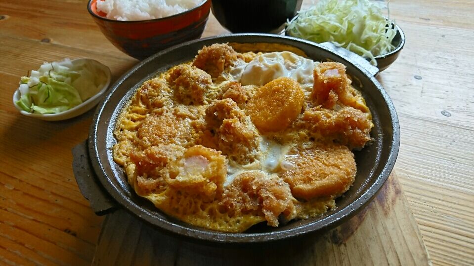 食べやすいサイズにカットした、ヒレカツ、エビフライ、ホタテ貝柱フライを卵で閉じこみました。