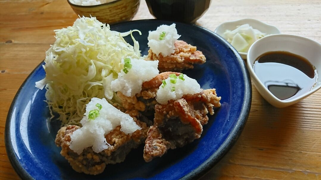大きな唐揚げをおろしとポン酢でお召し上がりください。