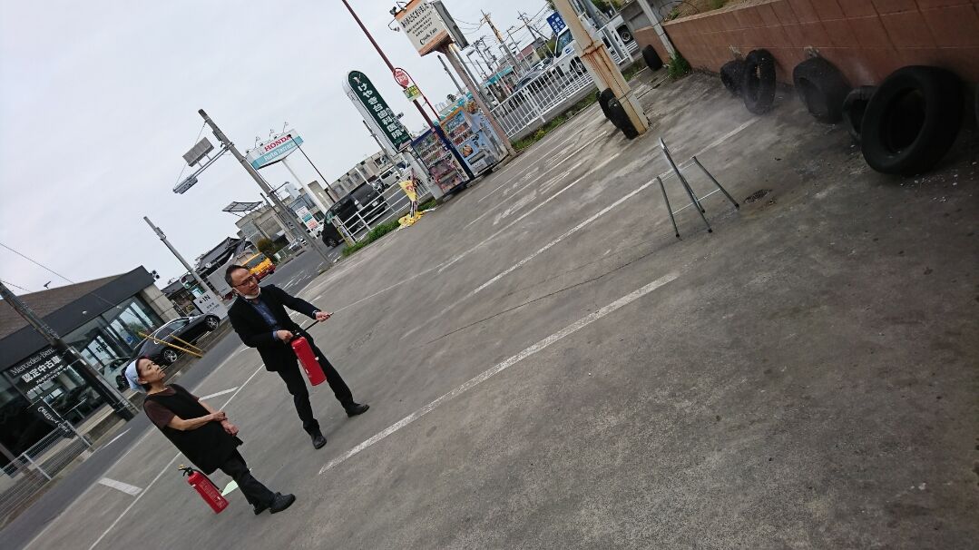 避難経路の確認、お客様への避難呼びかけ、通報、消火訓練など、一連の流れを行いました。