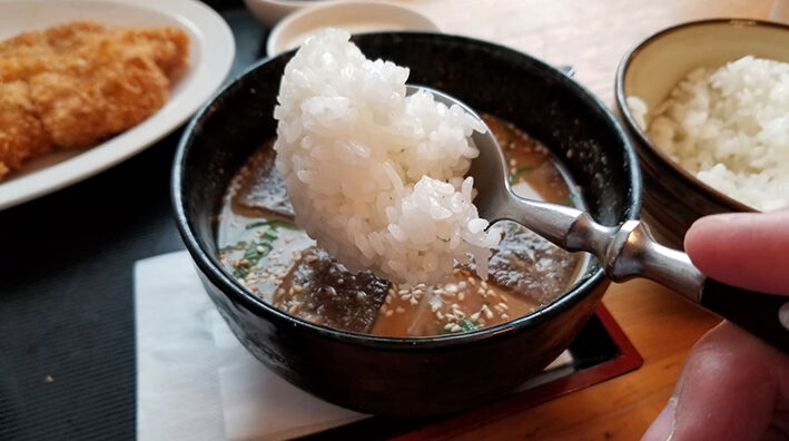「冷や汁ってさ、多分みんなあんまり知らないじゃん。でも食べると美味しいじゃん。サラサラっと食べれて、とんかつもすすむし。だったら、出来る範囲でいいから、ご飯を冷や汁にできますよ♪。って事にして無料で提供しちゃえば?」