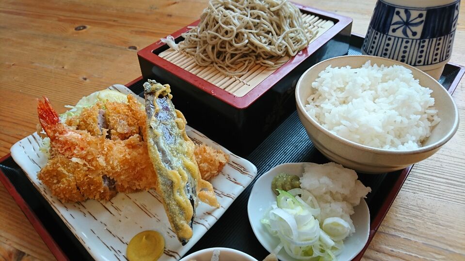 ざるそばの他にロースかつ、ヒレかついずれかに大ぶりのエビフライ、野菜天がついてます。
