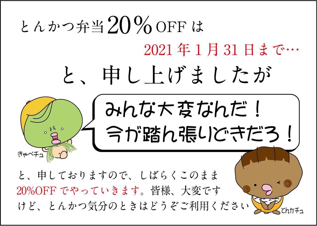 それでも、少しでも皆さんに元気になってもらいたくて「とんかつ弁当20%OFF」を昨年4月より継続してきました
