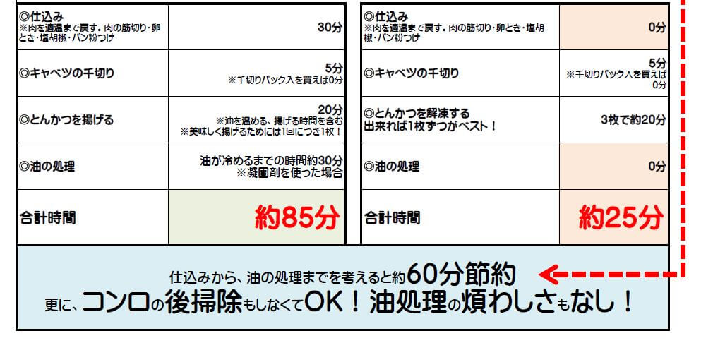 この比較は、付属品フルセットの冷凍とんかつで比較しているので、付属品なしの「シンプルシリーズ」だともう少し価格差は圧縮されそうですね