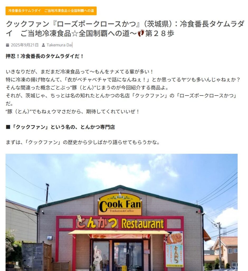「タケムラがWEBサイトで、クックファンの冷凍とんかつの記事を書いたので是非みてくださいね」と